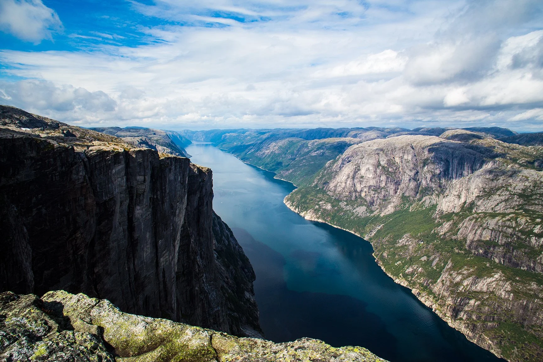 I line up with a million other tourists, and Johanssen gives us a brief demonstration on how to safely stand on the boulder. You're supposed to use one hand on a hook that sticking out from the side wall with very little ledge, hug the wall to make it around and face the boulder, sit, put your feet out, and press yourself onto the boulder into a standing position. Repeat these steps in reverse order to get back to the cliff safely- Under NO circumstances should you jump from the boulder to the cliff. After the briefing, I feel a bit more ready. Peer pressure sets in, and I stupidly feel at ease knowing everyone else is doing it, *(even though Johanssen stressed that if anyone feels too nervous, it's cooler to say "no", than put yourself in harms way). A few tourists go before me, and they make it look easy. This helps ease my mind more. I'm actually not feeling too giddy or nervous, but I wonder how I'll feel once I'm standing on the rock. Even though we’re early, it was suddenly my turn. As instructed, I cling to the boulder wall and hang on to a small hook, only big enough to fit my two fingers through. This is more nerve racking because there's hardly a ledge to the wall you're clinging to. On my toes, and literally hanging on for dear life, I shift around and over to the boulder wedged between the two cliffs. I sit on the ledge and with one foot, push myself onto the boulder, and slowly stand up. I can't think, or fear will take over. Knowing perfectly well there's nothing beneath the boulder that I'm standing on other than the 3,280ft. drop, I only look straight. I can see other tourists with their cameras, and Johanssen with his. I smile big, and stretch my arms out into the air. Still not daring to look down, I slowly turn around on the boulder, looking out to the fjord. Even though I’m not looking down, I’m so high up, that I can see a small ferry pass between the two cliffs. I wanted to pull out my phone and take some shots of my feet on the boulder, but I was starting to get nervous, and didn't want to get stuck... Or worse.